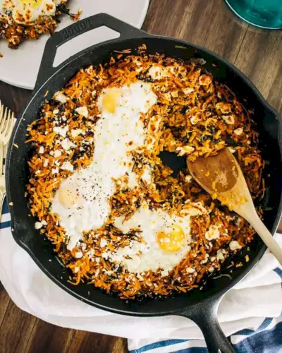 Zu guter Letzt in unseren Mangold-Rezepten: eine Süßkartoffel-Mangold-Abendessen-Pfanne! Geben Sie geriebene Süßkartoffeln in eine Pfanne (ggf. aus Gusseisen) und braten Sie sie an, bis sie knusprig ist. Rühren Sie etwas gehackten Mangold unter, um den Nährwert zu erhöhen, und schlagen Sie dann ein paar Eier hinein. Mit einer Prise salziger Feta-Käse-Streusel bestreuen. Kochen, bis die Eier fest sind, dann genießen!
