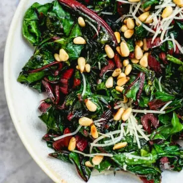 Ganz oben auf unseren Mangold-Rezepten: Sautierter Regenbogen-Mangold! Lassen Sie Mangold mit dieser klassischen, einfachen italienischen Beilage unglaublich schmecken. Mangold wird in der italienischen Küche oft mit gerösteten Pinienkernen serviert und verleiht hier genau die richtige nussige Essenz. Mit einer Prise Parmesankäse bestreuen, um genau die richtige herzhafte Note zu erhalten! Auch ohne Beilagen sind diese perfekt gesalzenen, mit Knoblauch sautierten Gemüse einfach fantastisch.