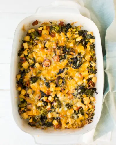 Eine weitere tolle Möglichkeit, Mangold in einem Rezept zu verwenden, besteht darin, ihn in einem gemütlichen Auflauf oder einer Auflaufform zu verstecken! Dieser Erntegemüseauflauf ist herzhaft und raffiniert: Er schmeckt fast fleischig! Es ist perfekt für den fleischlosen Montag oder einen gemütlichen Brunch. Es ist eine Kombination aus Gemüse und gebackenem Tofu, mit Käse belegt und sprudelnd gebacken.