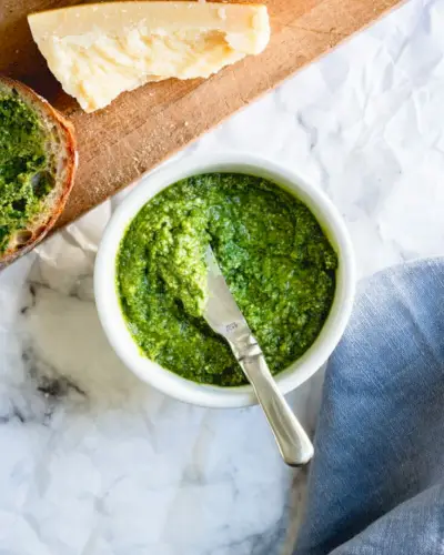 Eine weitere tolle Möglichkeit, Walnüsse zu verwenden? Im Pesto! Für diese italienische Soße werden normalerweise Pinienkerne verwendet, aber sie sind teuer. Ein einfacher Tausch? Verwenden Sie stattdessen Walnüsse zusammen mit frischem Basilikum, Knoblauch und Olivenöl! Der Geschmack ist großartig und sie sind viel sparsamer.