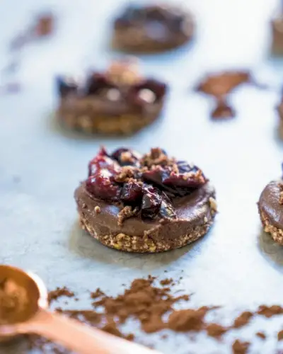 Hier ist eine weitere tolle Möglichkeit, Mandeln zu verwenden: in einer Dessertkruste! Diese Schokoladen-Kirsch-Desserthäppchen heben das Beste dieser natürlichen Kombination hervor: Schokolade und Kirschen. Sie sind reichhaltig und schokoladig, enthalten aber nur wenige Vollwertzutaten! Die Kruste besteht hauptsächlich aus Mandeln und Hafer, wird zu Streuseln vermengt und in eine Muffinform gepresst. Und das cremige Schokoladenmousse-Topping besteht aus nur drei Zutaten: Kokosöl, Ahornsirup und Kakaopulver. Mit köstlichen Süßkirschen garniert ist jede einzelne ein kleines Stück Himmel.