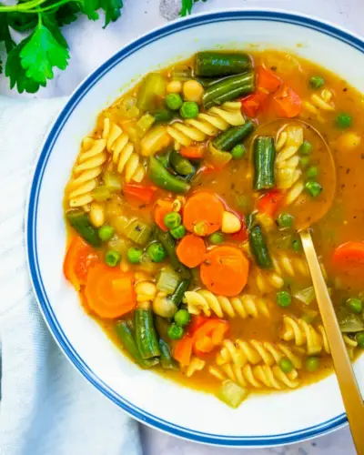 Last but not least in diesen Zwiebelrezepten: hausgemachte Gemüsesuppe! Hier ist ein Beispiel dafür, wie Zwiebeln in der Brühe einer einfachen Suppe eine entscheidende unterstützende Rolle spielen. Es ist gemütlich und beruhigend und besteht aus Nudeln und einfachen Gemüsesorten wie Karotten, Zwiebeln und Sellerie. Es ist fast wie eine Hühnernudelsuppe, die nur aus Gemüse besteht ... und sie ist voller herzhafter, herzhafter Geschmack (Danke, Zwiebeln!).