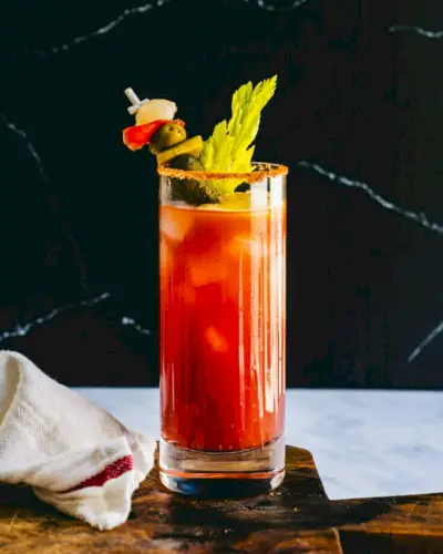Was wäre ein klassischerer Brunch-Cocktail als ein Bloody Mary? Es ist scharf und perfekt gewürzt, es steckt voller pflanzlicher Köstlichkeiten. Selbstgemachte Bloody Marys zuzubereiten ist viel köstlicher als die Mischungen, die man im Supermarkt findet. Fügen Sie dann mit der Beilage Ihre persönliche Note hinzu! Traditionell sind Selleriestangen und -spieße mit Gurken und Oliven. Probieren Sie ausgefallene Gurken, wenn Sie welche finden, wie Blumenkohl oder Okra.