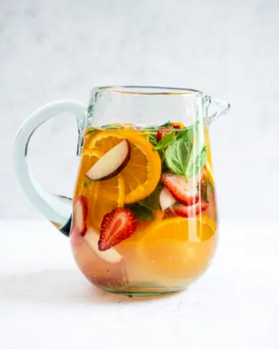 Auf der Suche nach alkoholfreien Brunchgetränken? Dieses mit Früchten angereicherte Wasser ist perfekt: und einfach zuzubereiten! Die leuchtenden Farben der Früchte sehen in einem Krug wunderschön aus. Und der Geschmack ist unglaublich erfrischend: Er ist leicht süßlich und aromatisch. Sie können hier alle Früchte und Kräuter verwenden, die Sie mögen.