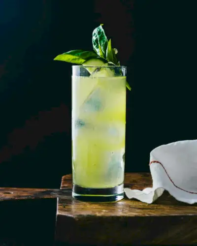 Zutaten: Gurkenscheiben. frisches Basilikum, Gin, Zuckersirup, Zitronensaft, Sodawasser (auch bekannt als Club-Soda )