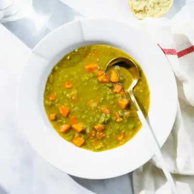 Diese vegane Instant Pot-Erbsensuppe ist die ultimative Mahlzeit: Sie ist sättigend, pflanzlich und lässt sich leicht im Schnellkochtopf zubereiten. Es ist ein leckeres, gesundes Abendessenrezept! Es hat einen angenehmen, leicht rauchigen Geschmack. Es ist eine Füllung Vollwertkost auf pflanzlicher Basis Rezept (WFPB), weil Spalterbsen viel pflanzliches Protein haben!