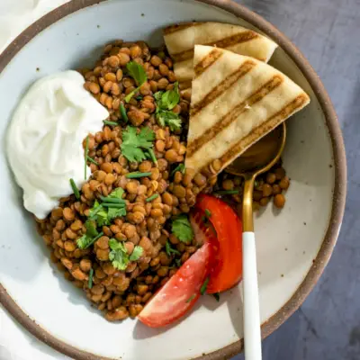 Die Linsen sind perfekt gewürzt und sehr saftig! Sie werden feststellen, dass aus der Schüssel des Schnellkochtopfs noch etwas Brühe übrig ist: Rühren Sie sie ein und die Linsen nehmen die Brühe auf, wenn sie stehen bleiben. Werfen Sie sie in eine Schüssel mit Fladenbrot, einem Klecks davon Cashewcreme , Tomatenspalten und gehackter Koriander für ein wirklich sättigendes veganes Instant Pot-Rezept.