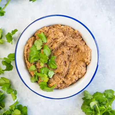 Selbstgemachte, gekühlte Bohnen schmecken so köstlich, dass es sich lohnt, sie zuzubereiten, wenn Sie Zeit dafür haben! Wir haben in letzter Zeit auch versucht, mit mehr getrockneten Bohnen zu kochen. Der Instant Pot eignet sich tatsächlich perfekt für selbstgemachte, gekühlte Bohnen, da die Einweichzeit entfällt! Geben Sie einfach die Bohnen hinzu und würzen Sie sie, und in einer Stunde sind sie perfekt zart. Probieren Sie sie bei uns aus Erfrischter Bohnendip mit Chips.