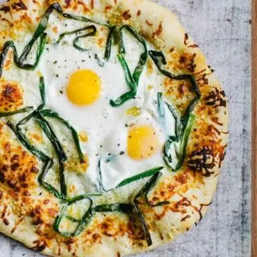 Als erstes in unseren Rezepten für Frühlingszwiebeln: Verwenden Sie sie als Pizzabelag! Da es sich um eine weiße Pizza handelt, gibt es keine Tomatensoße. Nur ein dünner Pinsel Olivenöl, garniert mit Mozzarella und scharfem Pecorino Romano-Käse. Geben Sie darauf Frühlingszwiebeln, die weich geröstet sind, und zwei Eier: Wenn Sie das Eigelb aufschlagen, bedeckt es den gesamten Kuchen mit einer herzhaften Soße. Ein absoluter Gewinner!