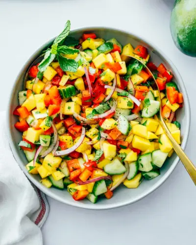 Probieren Sie als letztes in unseren Limettenrezepten diesen hellen und schönen Mangosalat! Es gibt nichts Besseres als die honigsüße Süße einer saftigen Mango, und hier finden Sie eine neue Art, sie mit Accessoires zu verfeinern. Kombinieren Sie es mit kühler Gurke, knackiger Paprika sowie Kräuterminze und Koriander und bedecken Sie das Ganze mit einem Honig-Limetten-Dressing. ICH