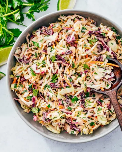 Probieren Sie diesen Koriander-Limetten-Krautsalat! Kohl in einem cremigen Dressing ist eine Sache. Fügen Sie aber noch die Prise frischen Koriander und einen Spritzer Limette hinzu, und schon geht es auf die nächste Stufe! Der Geschmack ist cremig, herzhaft und ideal als Beilage zu Hühnchen, Fisch oder vegetarischen Hauptgerichten. Oder werfen Sie es einfach in eine Tortilla Taco-Füllung , und den Rest nebenbei essen.