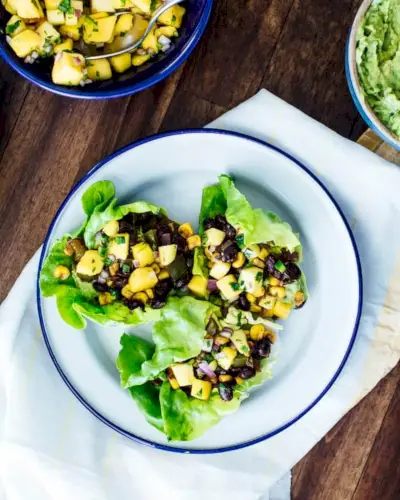 Dieses Rezept für Wraps mit schwarzem Bohnensalat ist hervorragend. Die Kombination aus Guacamole, würzigen schwarzen Chipotle-Bohnen und Mangosalsa ist eine Explosion von Geschmack und Texturen. Für einen vegetarischen Salat-Wrap sind sie überraschend sättigend. Und der Gesundheitsfaktor ist unschlagbar: Sie sind vollgepackt mit Gemüse und eignen sich für viele Diäten.