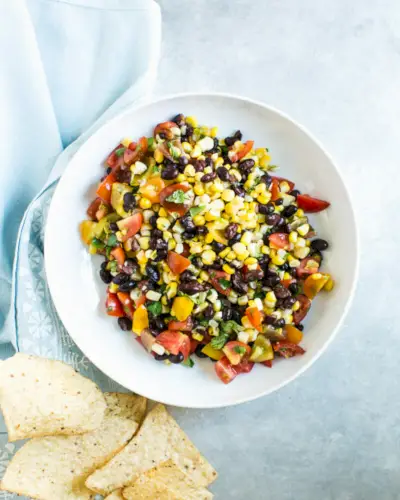 Hier ist ein weiteres tolles Rezept für Salsa mit schwarzen Bohnen: dieses Mal mit Mais! Es verkörpert alles, was am Sommer gut ist. Leicht gerösteter Mais, schwarze Bohnen, Gartenkirschtomaten und etwas Limette und Kreuzkümmel. Perfekt zum Dippen Tortillachips oder hineinwerfen Tacos !