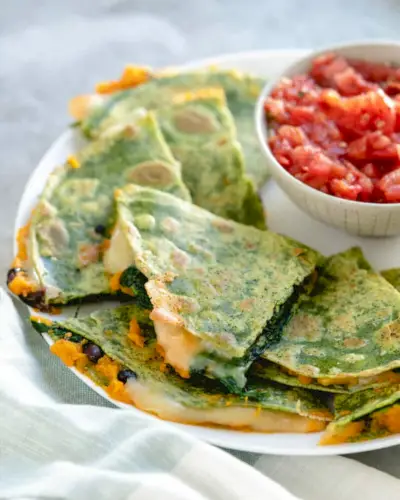 Schwarze Bohnen sind die perfekte Füllung für Quesadillas! Diese geladenen Veggie-Quesadillas sind vollgepackt mit Gemüse und Geschmack, darunter Süßkartoffeln, schwarze Bohnen und Kreuzkümmel. Wenn Sie möchten, machen Sie unser Hausgemachte Spinat-Tortillas , ein lustiges DIY-Küchenprojekt, oder im Laden gekauftes als Abkürzung verwenden.