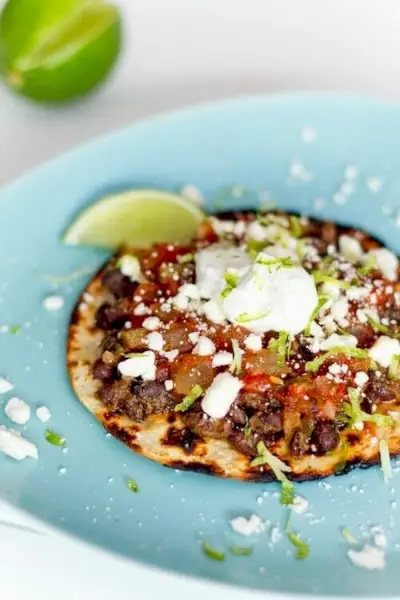 Dieses Tostada-Rezept mit schwarzen Bohnen ist schnell und lecker und enthält eine gegrillte Tortilla (anstelle der traditionellen frittierten). Mit schwarzen Bohnen, gerösteter Tomatensalsa und Queso-Fresco-Streuseln belegen und alles mit einem pikanten Sauerrahm-Dressing aus Kreuzkümmel und Limettenschale bestreichen.