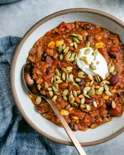 Hier ist ein weiteres Rezept für schwarze Bohnen-Chili, dieses ist so herzhaft, herzhaft und voller gesunder Zutaten! Es enthält ein Trio aus proteinreichen Bohnen, Quinoa und vielen Gewürzen. Wenn Sie möchten, fügen Sie optional Leinsamen hinzu, um den Proteinschub zu erhöhen. Und natürlich sind die Toppings genau das Richtige für Chili. Wir mögen einen Klecks Sauerrahm (oder Cashewcreme für milchfreie Gerichte) und knusprig geröstete Pepitas.