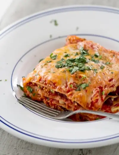 Als letztes in unseren Rezepten für schwarze Bohnen: Mexikanische Lasagne! Es ist die perfekte Fusion, wenn Sie nicht sicher sind, ob Sie italienisches oder mexikanisches Essen möchten. Die Nudeln sind mit schwarzen Bohnen, Mais, Tomatensauce und klebrigem Käse geschichtet. Mit frischem Koriander belegen und genießen!