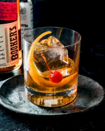 - Das Getränk in ein Lowball- oder Old-Fashioned-Glas abseihen. Mit Eis, einer Orangenschale und einer Cocktailkirsche servieren.
