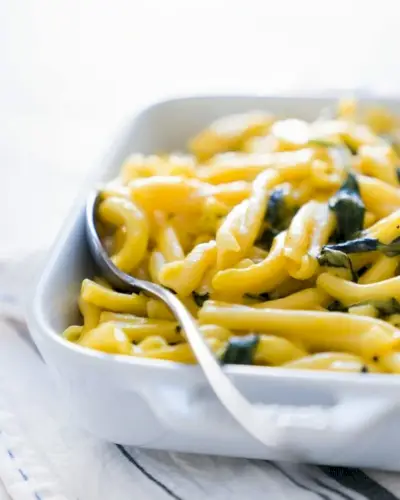 Warum nicht auch etwas Grün zu Mac and Cheese hinzufügen? Dieses Makkaroni-Käse-mit-Spinat-Rezept ist ein Familienfavorit und enthält griechischen Joghurt, der für zusätzliche Nährstoffe in die Käsesauce eingerührt wird. Der Spinat nimmt sofort den Käsegeschmack an.
