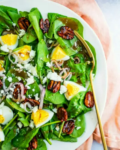 Hier ist ein Spinatrezept dazu beeindrucken . Es ist alles, was ein klassischer Spinatsalat sein sollte, voller Textur- und Geschmackskontraste. Sie werden kaum merken, dass Sie dieses gesunde Blattgemüse essen, wenn es mit würziger Balsamico-Vinaigrette überzogen ist. Es gibt knusprige, rauchige Pekannüsse, fast wie Speck, glasiert mit Ahornsirup und Sojasauce. Fügen Sie hartgekochte Eier oder einen knackig-säuerlichen Apfel hinzu und Sie haben einen atemberaubenden Beilagensalat, der jedem schmeckt ooo Und ahhh . (Das passiert jedes Mal, wenn wir es servieren … wirklich.)