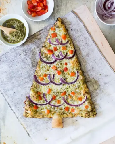 Hier ist eine Tradition, die Alex und ich zu jeder Weihnachtszeit praktizieren: Weihnachtspizza! Es ist das perfekte Gericht für den Heiligabend und vor allem Kinder lieben es, den Baum mit Gemüse zu schmücken. Dieses hier enthält rote Zwiebeln für Girlanden und rote Paprika als Verzierung. Und die grüne Farbe? Es kommt aus einer dünnen Schicht Basilikumpesto !