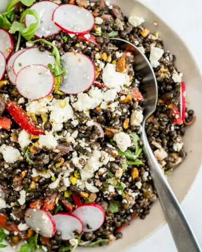 Hier ist ein erstklassiges Linsensalat-Rezept, das Sie Ihrem Arsenal hinzufügen können, und Mann, ist es lecker? Dieser frische und gesunde Linsensalat im mediterranen Stil, gemischt mit frischem Gemüse, Feta-Käse und Pistazien. Es ist eine köstliche Art, Protein als Beilage zu einem vegetarischen Weihnachtsessen hinzuzufügen. Sie werden nicht aufhören können, es zu essen!