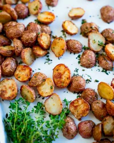 Was gibt es Besseres als eine außen knusprige und innen zarte Kartoffel? Für uns ist das matschige Zeug einfach kein Vergleich. (Obwohl diese Geröstete Knoblauchkartoffelpüree sind in der Nähe!) Wir zeigen Ihnen, wie Sie unsere Lieblings-Bratkartoffeln zubereiten, rote Kartoffeln, die mit Knoblauchpulver knusprig gebacken und dann mit frischen Kräutern übergossen werden.