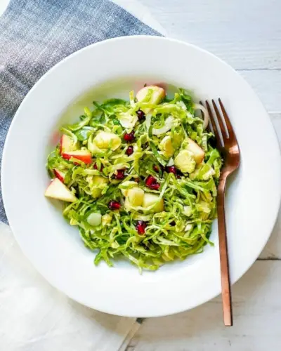Geraspelter Rosenkohl sind die perfekte Basis für einen Salat! Sie schmecken ein wenig wie eine süßere Variante von Kohl. Mit säuerlichen Granatapfelkernen, knackigen Äpfeln und einer würzigen Vinaigrette belegen, ist es ein wirklich erfrischendes Weihnachtssalatrezept.
