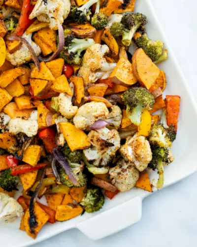Dieses geröstete Gemüse ist ein perfektes vegetarisches Weihnachtsgericht und ergibt die farbenfrohsten Blechpfannen, die selbst den wählerischsten Essern gefallen werden! Sie sind gesund, pflanzlich, vegan und glutenfrei und noch besser: schön und lecker. Dieses Rezept reicht für 2 Blechpfannen und das Braten dauert nur 30 Minuten. Wenn Sie das Weihnachtsessen vorbereiten, können Sie es vorher rösten und es dann vor dem Servieren in einem 200 °C heißen Ofen aufwärmen.