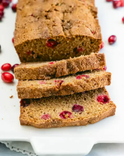 Dieses einfache Cranberry-Brot hat genau die richtige knusprige Außenseite und die richtige flauschige Innenseite. Es ist nicht zu süß, abgerundet mit säuerlichen Preiselbeeren. Das Beste daran? Ein Hauch Vanille und Bourbon rundet das Ganze ab. Es ist ein bisschen gesund, aber es ist in jeder Hinsicht ein Festtagsgenuss! Es eignet sich perfekt als Weihnachtsvorspeise oder auf einem Desserttablett.