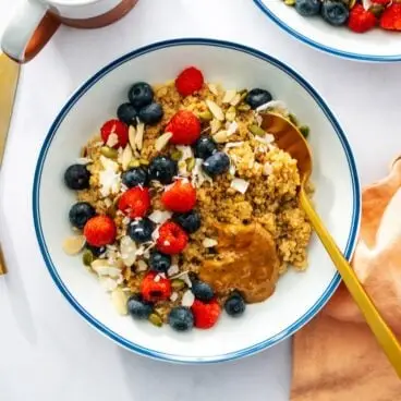 Diese Frühstücks-Quinoa-Bowl ist ein herzhafter und gesunder Start in den Tag! Füllen Sie dieses Vollkorn mit leckeren Belägen.