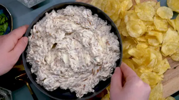 Dieses Rezept hebt die Aromen des American Standby auf ein ganz neues Niveau. Die Verwendung von karamellisierten Zwiebeln – drei davon, um genau zu sein – verleiht eine einzigartige Süße, die eine Suppenmischung einfach nicht bieten kann; Die Zwiebeln langsam in Butter kochen, bis sie zart und goldbraun schmelzen. Zusätzlich zur Sauerrahm verleiht die großzügige Menge Frischkäse dem Dip etwas mehr Fülle und sorgt für ein geschmeidiges, samtiges Mundgefühl. Fein gehackte Petersilie, frisch gemahlener Pfeffer und ein Hauch Worcestershire – zusammen mit Zwiebelpulver, um den Zwiebelgeschmack zu verstärken – runden das Ganze ab.