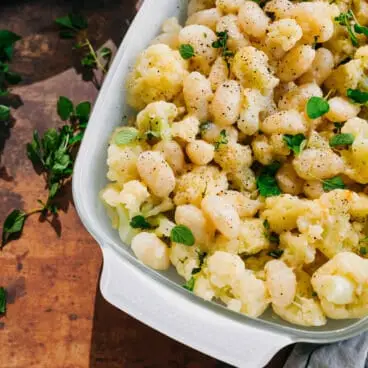 Dieser käsige Blumenkohlauflauf ist gemütlich und mit Parmesankäse gewürzt. Das Beste daran? Zähe Gnocchi-Kissen werden mit dem Blumenkohl vermischt, was eine überraschende Mischung aus sättigenden Häppchen ergibt.