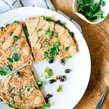 Am wichtigsten ist, dass diese Chipotle-Quesadilla vor Geschmack nur so strotzt – die Art, bei der sowohl Alex als auch ich „Wow“ murmeln, während wir noch den ersten Bissen kauen. Die Hauptzutat hier ist cremige Avocado, die der Füllung gesunde Fette und Reichhaltigkeit verleiht, ohne dass eine große Menge Käse erforderlich ist. Und die pikante Chipotle-Limetten-Tahini-Sauce ist der Hingucker. Möglicherweise habe ich die Schüssel sauber geleckt (ok, das habe ich).