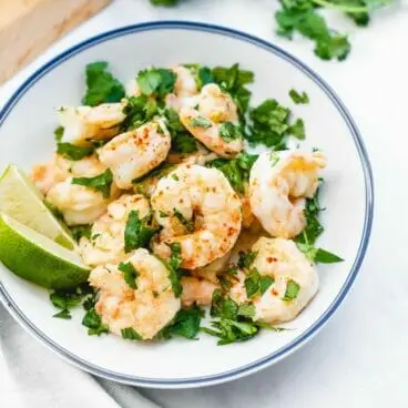 Was ist besser als Garnelen zum Abendessen ? Es ist gesund, einfach zuzubereiten und köstlich: Das macht es zur dreifachen Bedrohung beim Kochen unter der Woche! Und hier ist unsere neue Lieblingsart, es zuzubereiten: Koriander-Limetten-Garnelen ! Die Zubereitung dieses Rezepts dauert nur 10 Minuten und schmeckt wunderbar würzig und frisch! Es passt perfekt zu mexikanischen Aromen: Servieren Sie es dazu Reis , ein Avocadosalat , oder in Tacos . Oder machen Sie es zu einem Hauptgericht Salat gekrönt mit unserem Koriander-Dressing . So machen Sie es!