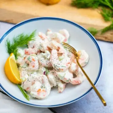 - Kombination aus griechischem Joghurt und Mayo: Der Schlüssel zum cremigsten und besten Garnelensalat! Die Soße schmeckt herzhaft und cremig, aber die Verwendung von hauptsächlich griechischem Joghurt mit einem Hauch Mayonnaise trägt dazu bei, dass sie weniger kalorienreich und reichhaltig bleibt.
