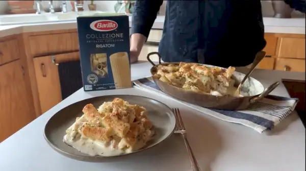 Die Nudelmischung in eine 8 x 6 x 2 Zoll große, grillfeste Auflaufform geben, die auf einem Backblech mit Rand steht. Geben Sie 1 Tasse Käsemischung in einer gleichmäßigen Schicht darauf.