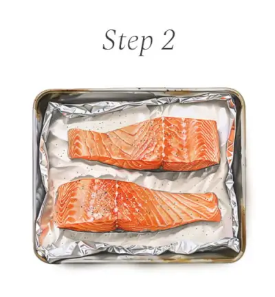 Schritt 2: Legen Sie den zimmerwarmen Lachs auf ein mit Folie ausgelegtes Backblech. Mit Olivenöl beträufeln und würzen (siehe vollständiges Rezept).