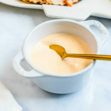 - Sauerrahmsauce: Diese Sauce ist reichhaltig und cremig. Es ist etwas cremiger als die unten stehende Option, die durch die Mayonnaise einen herzhafteren Geschmack hat.