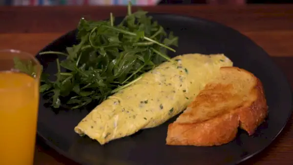 Kippen Sie die Pfanne mit einem Unterhandgriff am Griff weg und rollen Sie den mit weichen Rühreiern gefüllten Eier-Crêpe zum Rand der Pfanne gegenüber dem Griff. Den Rand mit Stäbchen in das Omelett stecken. Das Omelett mit der Nahtseite nach unten auf den Teller legen.