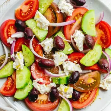 Ich gebe ein Geständnis: Ich bin ein ehemaliger Tomatenhasser. Vielleicht kennen Sie einen oder sind selbst einer. Diese rosafarbenen Tomaten außerhalb der Saison aus meiner Jugend haben mich abgeschreckt, bis ich fast ein Vierteljahrhundert alt war. Erst als ich reife, rote Tomaten vom örtlichen Bauernmarkt entdeckte, konnte ich meine Abneigung überwinden. Wenn Sie unsicher sind oder den Mut zum Thema Tomaten fassen möchten, ist dieser griechische Salat mit einigen reifen Sommertomaten ein guter Anfang.