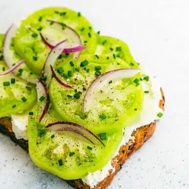 Dieses Rezept mit grünen Tomaten eignet sich hervorragend als Vorspeise, Mittagessen oder leichtes Abendessen – wir haben es neulich Abend als selbst zusammenzustellendes Abendessen direkt vom Schneidebrett serviert. Was ist Ihr Lieblingsrezept für grüne Tomaten? Lass es uns unten in den Kommentaren wissen!