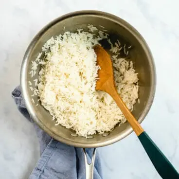 Geben Sie den Reis wieder in den Topf und decken Sie ihn ab. 5 Minuten dämpfen, dann aufdecken und mit einer Gabel auflockern. Hinzufügen koscheres Salz und es ist servierfertig! Das ist alles, was Sie über die Zubereitung von Basmatireis wissen müssen!