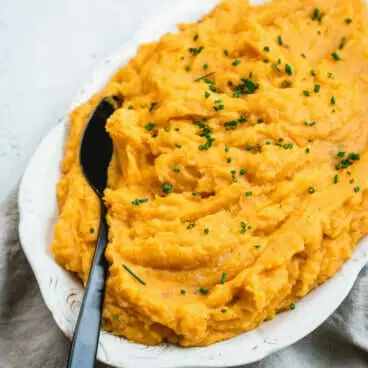 Ein weiterer Vorteil dieses Instant Pot-Kartoffelpürees gegenüber dem Standard-Kartoffelpüree besteht darin, dass Sie lediglich etwas Sahne, halb und halb, oder sogar milchfreie Milch benötigen, um es cremig zu machen. Sie brauchen weniger Fett als die Standardkartoffel, um gut zu schmecken, und die Süße macht Butter überflüssig. Dieses Süßkartoffelpüree ist also auch verdammt gesund!