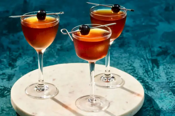 Einer dieser Riffs, der Manhattan, ist im Wesentlichen nur ein Old Fashioned mit einer Unze süßem Wermut anstelle eines Würfelzuckers sowie Roggenwhisky, der von den New Yorkern dieser Zeit bevorzugt wurde. Roggenwhisky tendiert normalerweise stärker zu trockenen Pfeffernoten, verliert jedoch etwas von der abgerundeten Süße von Bourbon. Süßer Wermut trägt dazu bei, dies zu untermauern, indem er den Whisky mit Aromen von dunkelroten Früchten, Zitrusfrüchten und Gewürzen in Einklang bringt. Die für Manhattan typische Maraschino-Kirschgarnitur verbindet diese Elemente.