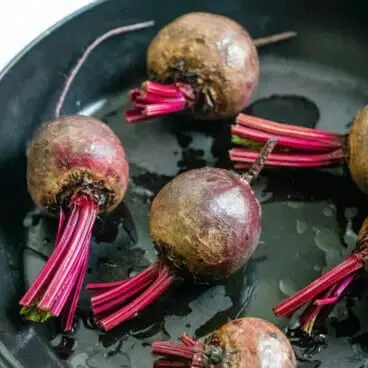 Hier ist die Rote Bete kocht man am besten: im Ganzen geröstet. Dieses Rezept für im Ofen geröstete Rüben dauert etwa eine Stunde, bringt aber den süßesten Geschmack hervor. Sie brauchen nicht einmal Salz und Pfeffer, sie sind so gut! Alex und ich waren überwältigt von dem Geschmack, der gebackenen Rüben entspringt. Wir lieben sie mit Ziegenkäse als Vorspeise, in a Rübensalat , oder zu leuchtend rosa Hummus gesaust.