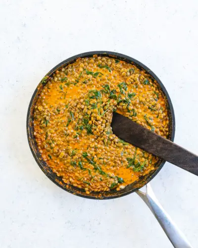 Dieses Kokos-Linsen-Curry ist eine einfache 30-minütige Idee für ein Abendessen, das gesund und voller Geschmack ist. Es handelt sich um ein pflanzliches Rezept, gewürzt mit Thai-Curry-Paste.