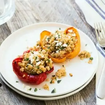 Dieses vegetarische Rezept für mit Quinoa gefüllte Paprika ist ein farbenfrohes und köstliches, gesundes Abendessen voller mediterraner Aromen wie Zitrone, Petersilie und Feta.