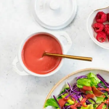 Diese Himbeervinaigrette basiert auf unserem Erdbeersalatdressing , ein weiterer Favorit in diesem Haushalt! Das Hinzufügen von Obst zu einem Salatdressing ist eine Möglichkeit, es gesünder zu machen als die meisten Salatdressings. Durch das Einmischen von Früchten wird das Dressing cremig, ohne dass mehr Öl hinzugefügt werden muss. So kommen Sie mit weniger Öl und mehr Geschmack aus! Mit diesem Fruchttrick wiegt dieser nur 100 Gramm 43 Kalorien pro Esslöffel .