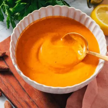 Suchen Sie nach einer geschmacksintensiven Sauce, deren Zubereitung nur wenige Minuten dauert? Das geröstete rote Pfeffersauce ist voller pikantem Geschmack, kein Kochen erforderlich! Geben Sie ein paar Zutaten in einen Mixer und es entsteht eine leuchtend orangefarbene, würzige Knoblauchsauce. Es ist äußerst vielseitig: Verwenden Sie es für eine Pastasauce, als Dip für Gemüse oder Pommes Frites oder als Sauce für Fisch oder Hühnchen. So macht jede Mahlzeit mehr Spaß!